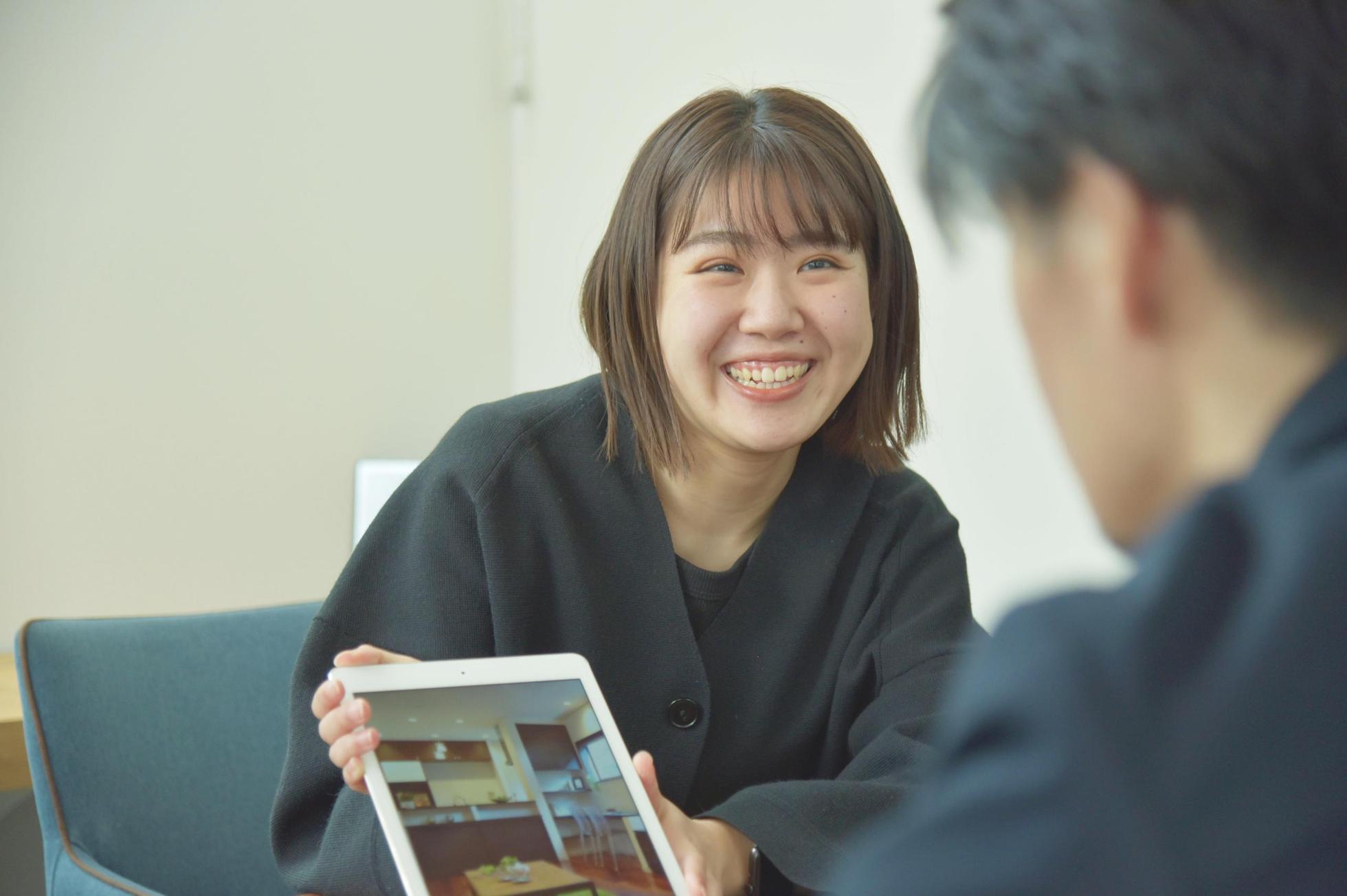 2022年4月に入社したばかりなので、毎日勉強の日々ですが、先輩に教わったことをその都度メモして反復して覚えて少しずつ知識を増やしています。まだまだ独り立ちは難しいですが、新人ならではのフレッシュさと笑顔を絶やさないことを心がけ、お客様に心地よい空間をお届けできるよう心がけています。 提案したものに対してお客様が喜んでくれたり、お客様の希望が叶い笑顔になってくれることにやりがいを感じています。 一生に一度のお家づくりなので、お客様のご希望をできるだけ一緒に叶え「頼んでよかった」と思えるようなご提案を一生懸命させて頂いております。