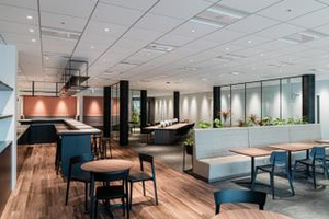 オフィスのコンセプトは、「TORIHADAを造りに集まりたくなる空間」。執務スペースの横にこういった食事や打ち合わせができる万能なフリースペースを広く設け、様々な業種のメンバーが入り混じり、シナジーを生んでいきやすい環境となっています。