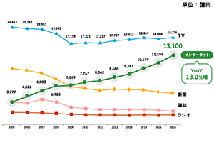 日本の媒体別広告費: (株)電通「日本の広告費2016」より