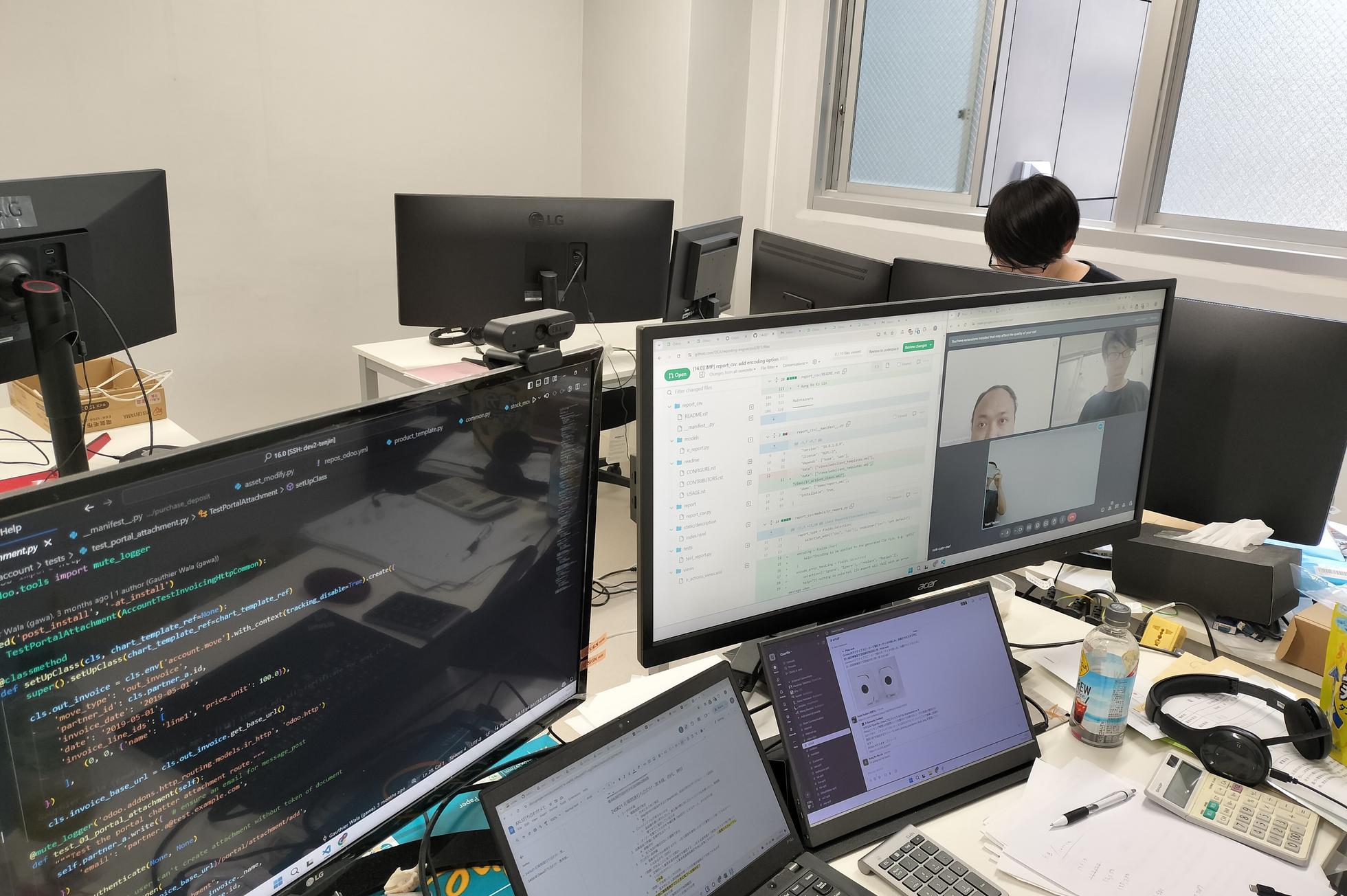 乱雑ながら作業効率の高い仕事環境です(ちょっと片付けないとですね…)。外付けモニターがたくさんあります。生産性を高めるものには積極的に投資します。
