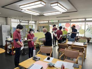 共生型デイサービス「青春道場春風」にて、脳トレの休憩中に職員とお客様で談笑をしています♪
