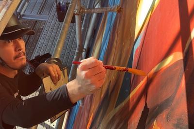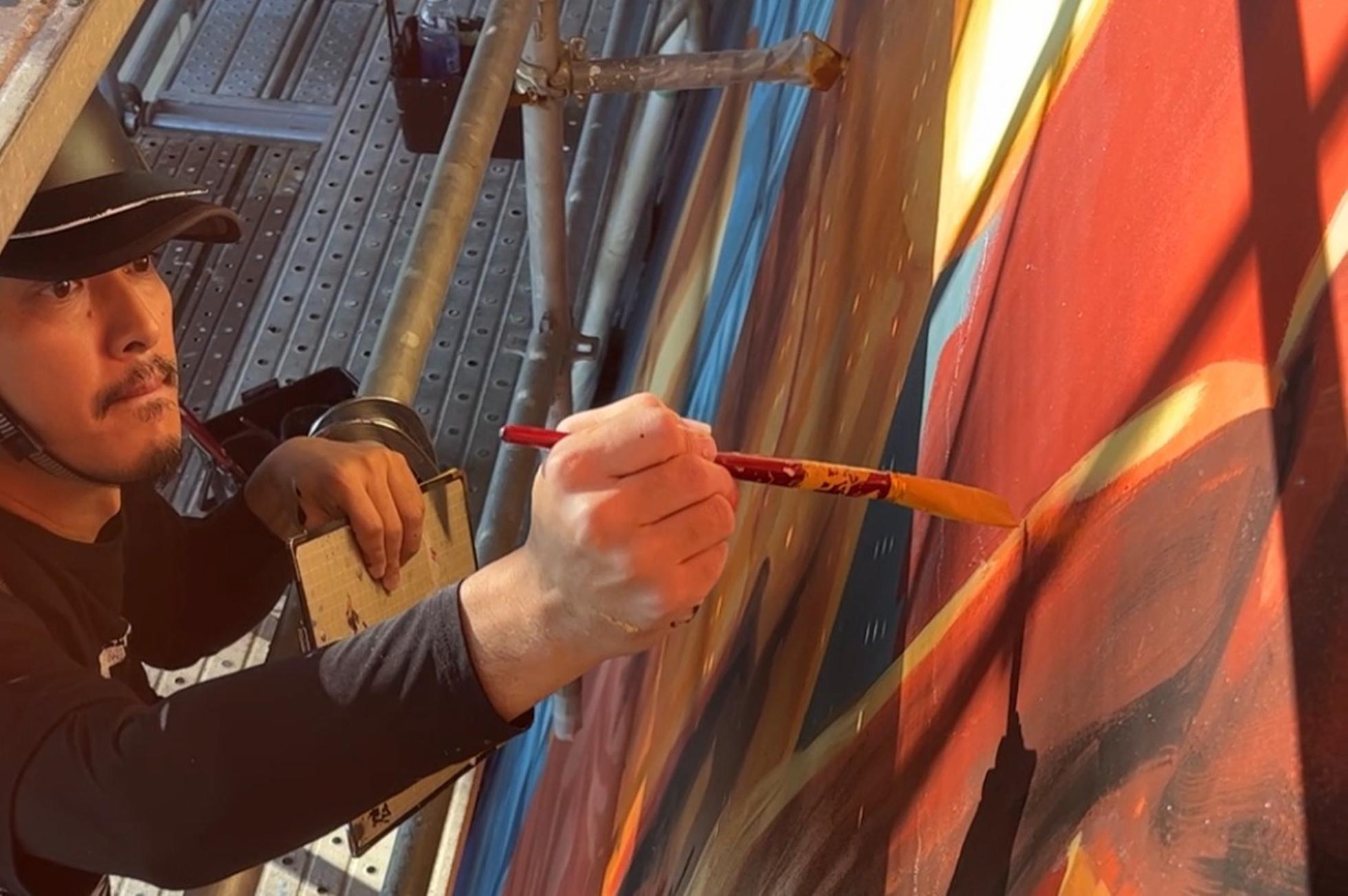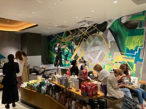 スターバックスコーヒー渋谷パルコ店壁画。お客様がいらっしゃる横でライブペイント。しかも3年間で4回、描き変えるというか上から絵を重ねていく提案。ただ壁画を制作するだけでなく「どこで」「いつ」「どのように」制作すると一番盛り上がるのか、お客様にとって意味のある壁画になるかを考えることが大切です。出来上がるものは壁画アートというシンプルなものですが、シンプルなものだからこそ、やり方を工夫して感動を大きくすることが可能です。
