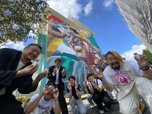 歯の詰め物セメントを作る株式会社GCの工場に巨大壁画。創業者がセメント瓶を双眼鏡にして未来を見通す姿を描いた。完成記念の写真はみんなで商品の瓶を持って撮影。この笑顔が一番の僕たちの作品かもしれません。大規模な壁画プロジェクトが年々増えています。プロジェクトの始まりから長いものですと1年かけて完成させるイメージのものも。さらに大規模な案件で今いただいているオファーも3年後に制作というプロジェクトもいくつかあります。