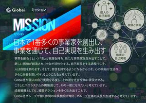 ミッション 日本で1番多くの事業家を創出し、事業通じて、自己実現を生みだす 事業を創ろうという『志』と視座を持ち、 新たな事業家を生み出すことで、新たなベンチャー企業が誕生し、新しい価値が創造され、社会が活性化する。 自己実現をする過程でこそ、人は自信を持ちます。そして、自信を持てるようになるからこそ、心の余裕が生まれ、さらに他者を思いやれるようになると考えています。 Giobai社が個人の自己実現を応援し、その波を社会全体に波及させる。こうしたエコシステムの構築通じて、その一助になりたいと考えています。 成長戦略としても、経営ポジションを多く生み出すことで、Giobai社グループで働く仲間の成長機会が増え、グループ全体の成長が加速すると考えています。