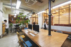 SNAP最奥部のオフィスエリアです。SNAP内は完全フリーアドレスなので、ソファーでのミーティングや個別ブースを使っての集中作業など、業務内容や気分に合わせて場所を選べます。