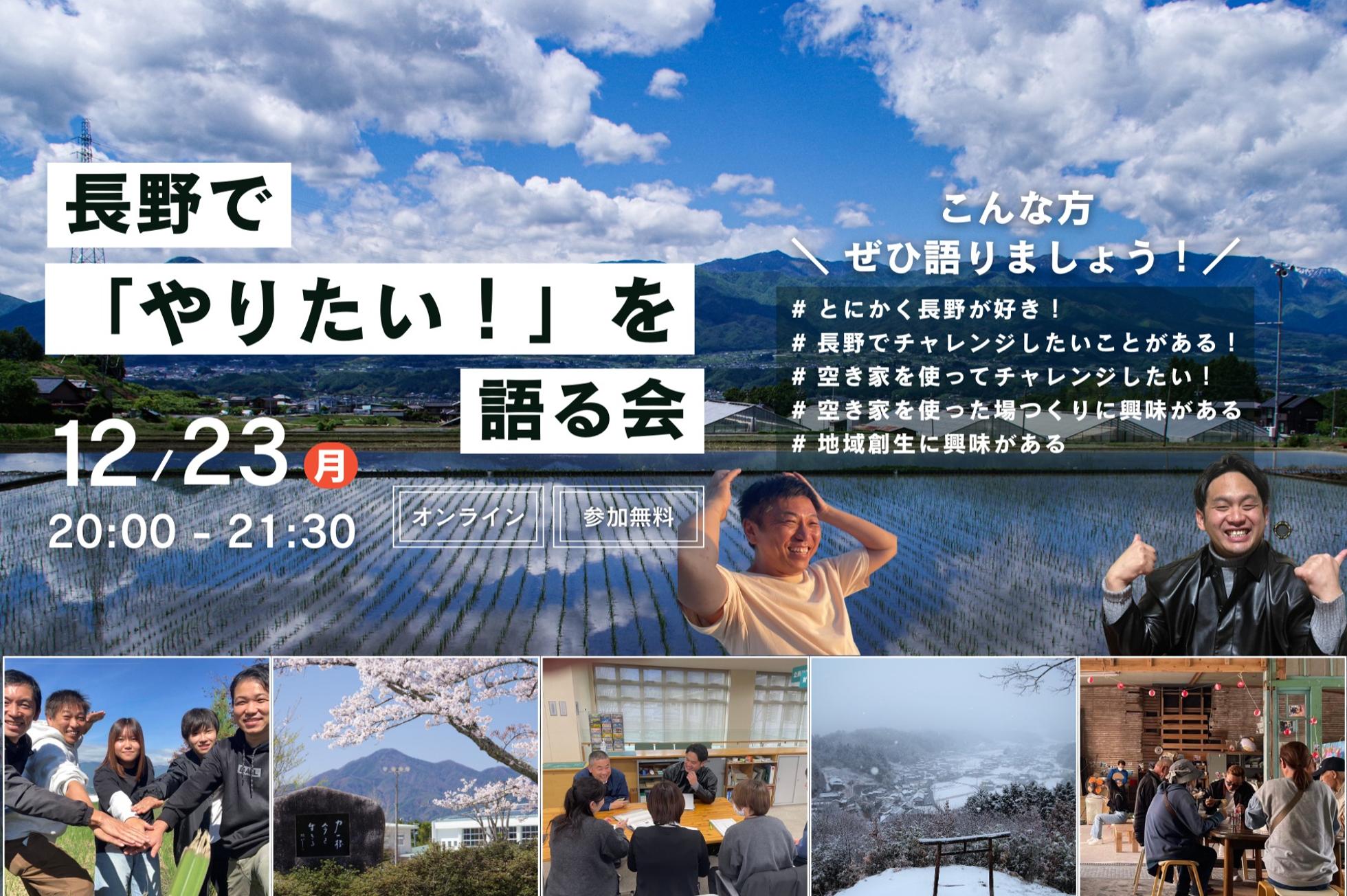 【 ミートアップ概要 】  ◆日時:2023年12月23日(月)20:00~ ◆参加方法:zoom(事前にメールでご案内させていただきます) ◆申込方法:「興味ある」を押していただいた方へ申込フォームをお送りします。 ◆タイムテーブル ▸代表近藤の活動とあゆみ、そしてこれまでの想い 過去20以上の自治体と関わってきた近藤が、どうやって地域と関わり、事業を作ってきたのかそのリアルをお伝えします。 ▸地域での数々の事例紹介  『じもと食堂』や『みんとしょ』など ▸長野県での今回の取り組み  長野県で空き家を使った取り組みの構想をお話します。 ▸長野で活動するメンバーとの交流  是非、地域創生の現場のリアルを聞いていただいたり 「こんな活動をしてみたい」などの想いもシェアしていただきたいと思っております! 我々の取り組みや雰囲気を見て、 「一緒に働いてみたい」と思った方はミートアップ後に個別にお話ができればと考えております。 まずは少しでもピンとくる方、 地方創生に興味があったけど動き出せていなかった方、 是非この機会に「イベントに参加する」という一歩からいかがでしょうか? 長野の未来に興味ある、あなたのご参加を心よりお待ちしております!