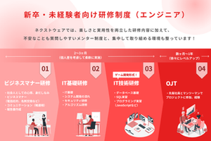 ◆ 文系や未経験の方でも安心の教育体制 ◆ ・ビジネスマナーの習得 ・基礎的なIT技術や、実践的なスキルの習得 ・研修後は年齢の近い先輩と一緒にプロジェクトに参画 ・1年間のOJTを通じて実務経験を重ねる ◆ スキルアップの支援体制 ◆ ・どのプロジェクトでも必ず同僚や上司とチームでの開発 ・プロジェクト内での疑問や不安な点はすぐに相談可能 ・資格取得のための教材や受講費用は会社が全額負担 ・資格取得者は月に1度の全社ミーティングで表彰 ※毎月10名以上の社員が新たな資格を取得し表彰されています ◆ プライベートが充実する働き方 ◆ ・有給休暇の取得率100% ・産休・育休の取得率100% ・育休からの復職率100% ・経済産業省の「健康経営優良法人認定制度」に選出 ・月平均残業時間は10時間 ※18時になるとほとんどの社員が退社します ▍ネクストウェアの充実した制度と手当 社員の「スキルアップ」「キャリア」「プライベート」を全面的に支援するため、一般的な制度からエンジニアに嬉しいユニークな制度まで、さまざまなサポートを完備しています。 ①制度 ・奨学金返済支援制度 ・1時間単位で利用可能な有給消化制度 ・保養所、ホテル等優待や旅行補助あり ・資格取得支援制度(100種類以上の資格が対象) ・社内イベント各種(納会、納涼会、忘年会、BBQ大会) ・各種社会保険完備(健康保険・厚生年金・雇用保険・労災)   など ②各種手当 ・家族手当 ・役職手当 ・出張、在宅手当 ・交通費全額支給手当 ・エンジニアインセンティブ手当   など ====================================================================== ★ 社員インタビュー:実際の声を聞いてみました! ・業界未経験からの転職!仕事もプライベートも充実した日々の過ごし方とは!? https://www.wantedly.com/companies/company_1336574/post_articles/916245 ・未経験OKな開発会社を正直レビュー。業界未経験から飛び込んだ中途メンバーの本音とは? https://www.wantedly.com/companies/company_1336574/post_articles/916252 ======================================================================