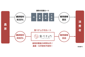 全国のこだわり農家さんが、手間をかけずに、自由に出店できるオンライン直売所「食べチョク」を開発しています。 ■ 食べチョク https://www.tabechoku.com/ 生協やOisixといった産直サービスと異なり、“生産者が直接” 食材を販売・発送します。 好みに合う生産者を選んでくれる野菜定期便「食べチョクコンシェルジュ」、旬な果物が定期的に届く「食べチョクフルーツセレクト」、友達と分けあえる「共同購入」の機能、販売前に商品を取り置きできる予約機能など、様々な買い方を提供しています。現在個人や飲食店の利用者も右肩上がりで増加しています。 また、2019年からは肉や魚、酒の取り扱いを開始し、こだわり食材の総合マーケットプレイスに発展しました。 メディア掲載実績 ◯ <Forbes> 「正しく儲かる」農業ビジネスで上場を目指せ #30UNDER30 https://forbesjapan.com/articles/detail/29289 ◯ <NewsPicks> 【農業改革請負人】農家と消費者をつなぎ、農業界の“メルカリ”を目指す https://m.newspicks.com/news/3544453 など多数。