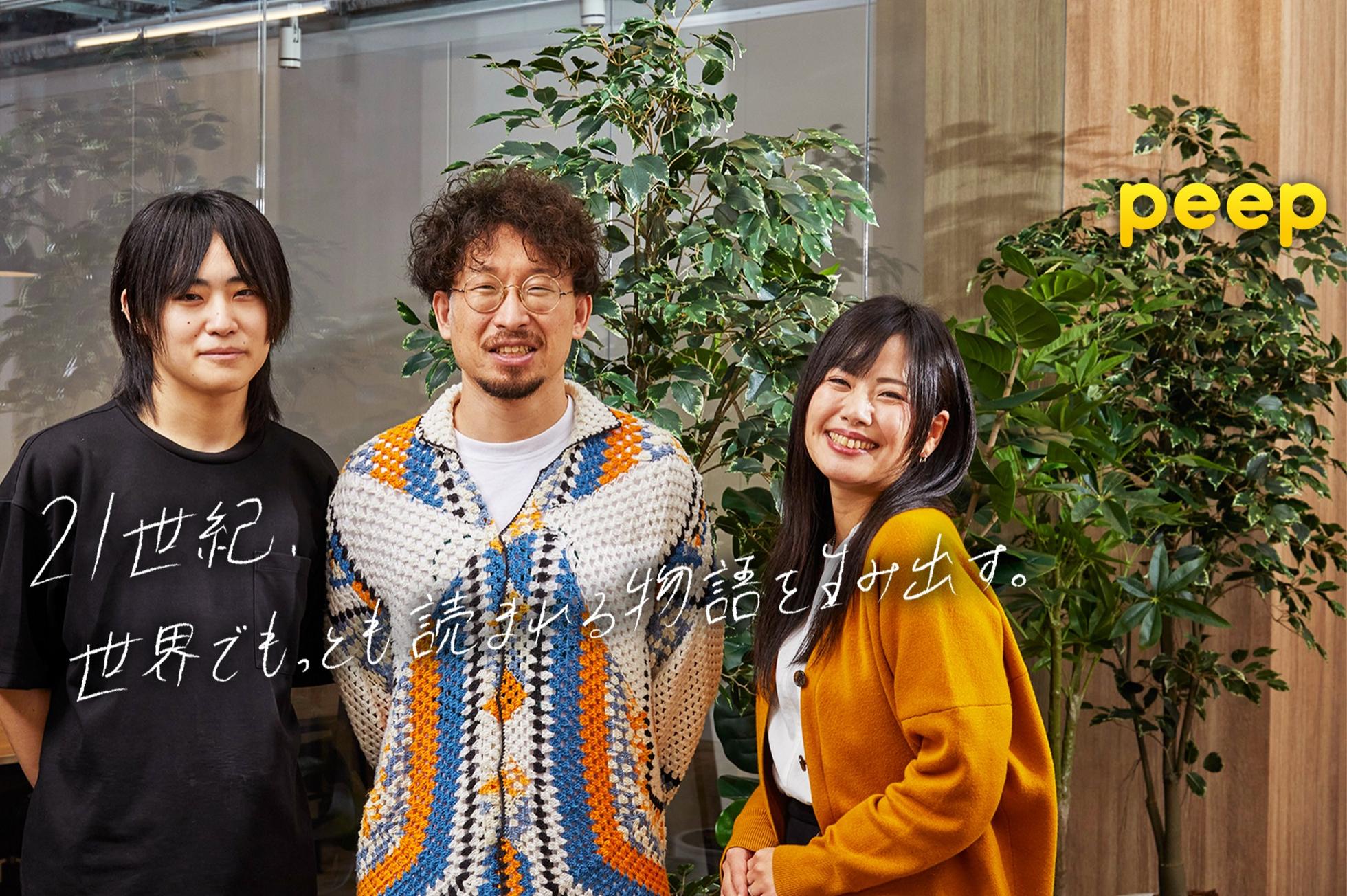 「21世紀、世界でもっとも読まれる物語を生み出す。」 マンガ・ノベルアプリ『peep』を運営する当社では、掲載作品である原作シナリオ(チャットノベル)の開発から、マンガ(モノクロデジタルコミック)等さまざまなデジタルコンテンツの編集・制作を行っております。peepだけではなく、さまざまな電子書籍アプリ・サービスでも配信しており、日々たくさんの読者・ファンの方々に応援いただいております。 私たちは、生み出した作品が多くの人に読まれることがこの上ない喜びであり、作品を通して人とつながることこそがクリエイターの欲求の根源だと考えます。生み出した作品をより多くの人に届けるため、私たちはグローバルでNo.1を目指します。世界を舞台にエンターテイメントの世界に挑戦することは、高い水準のマインドを必要としますが、私たちは本気で世界中の人々を楽しませたい、そして世界一の作品を生み出せると信じています。