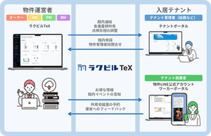 物件管理者向けの「ラクビルTeX」、テナント管理者向けの「テナントポータル」、テナント従業員向けの「LINE公式アカウント」「ワーカーポータル」を提供しています