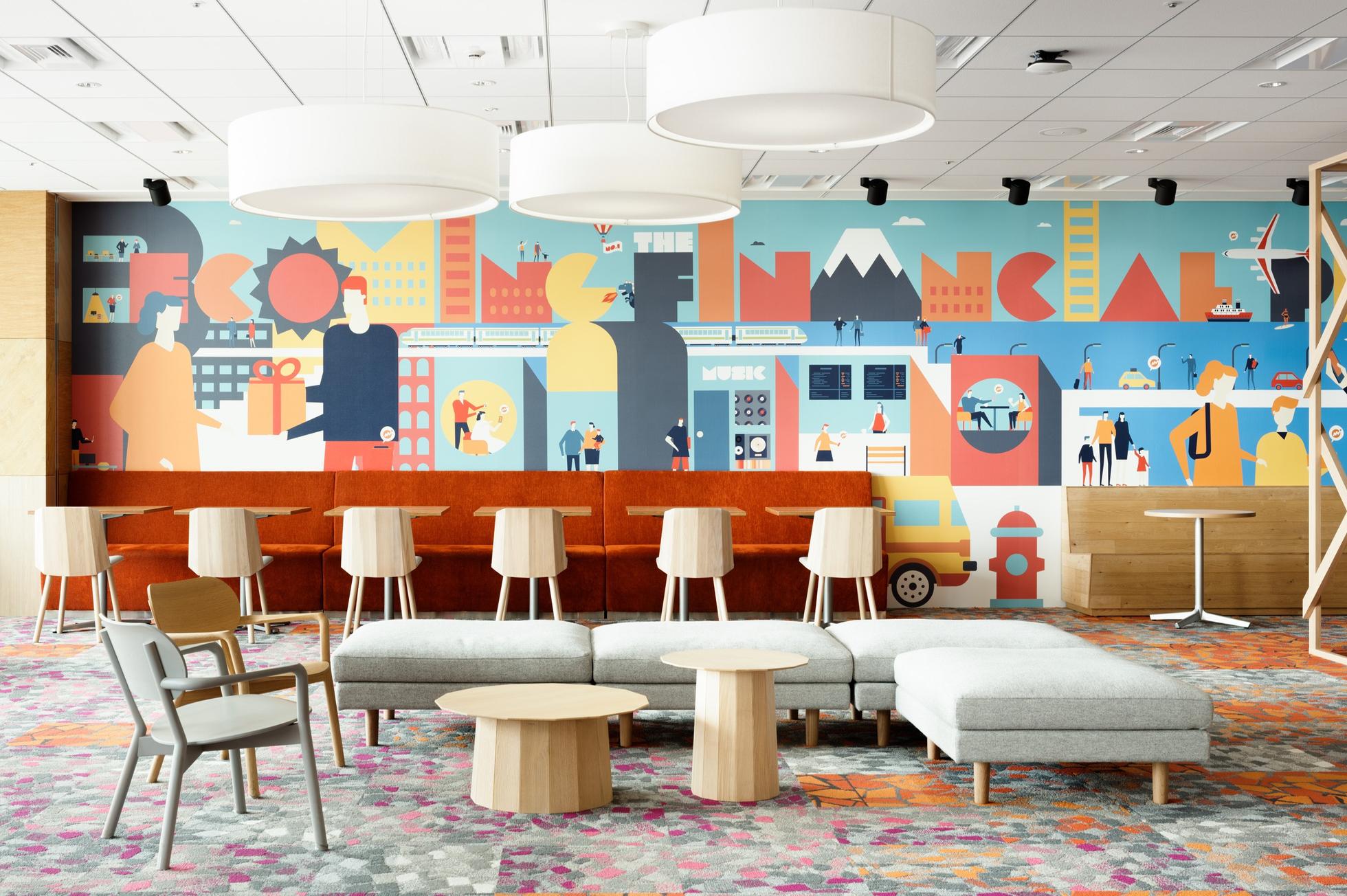 社員の憩いの場、リフレッシュルーム。写真では伝わりにくいですが100名規模のイベントができるゆったりとしたスペースで社員が休憩したり談笑しています。