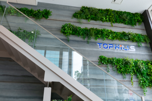 4月に内装リニューアルした当社。 常務取締役の江原が内装のディレクションをとった緑あふれるこだわりのエントランスが社員やお客様をお迎えします。