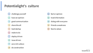 カルチャーの一つに「challenge yourself」があります。 ポテンシャライトは、会社としてメンバーのチャレンジを推奨しており、失敗しても責められることは一切ありません。 経験や入社年次は関係なく、全員にチャンスが提供されるカルチャーです。