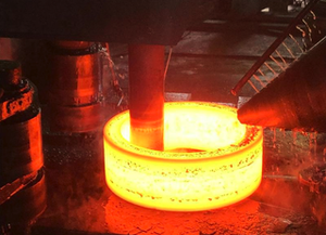 実際に鍛造を行っている時の様子です。熱して真っ赤になった鉄の塊をフォークリフトや専用の機械を使って、様々な形に変えていきます。