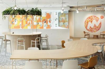 社員の憩いの場、リフレッシュルーム。写真では伝わりにくいですが100名規模のイベントができるゆったりとしたスペースで社員が休憩したり談笑しています。