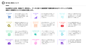 システム開発、大規模サイト構築、ECサイト制作などを500名規模のフリーランスクリエイターと共に実施。Web制作から運用まで一貫して提供することで、幅広いクライアントニーズに応えています。