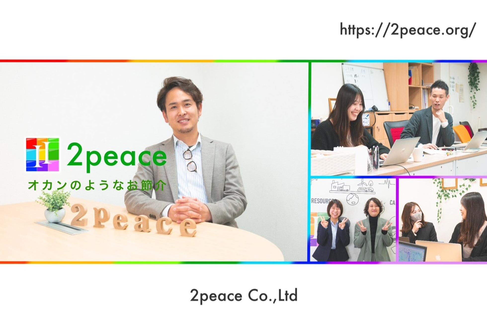 ■オカンのようにお節介で温かく■ 仕事は相手があって初めて成り立つもの。 自分に目を向けるのではなく、他人を思いやれる人間であり続けます。 ▍人財の力で企業の発展に役立ち、豊かで明るい社会づくりに貢献する。 私たちは「人間力」にフォーカスして、人財の皆さんにしっかりと指導、教育を行っています。 人財には2peaceで働くメンバーだけでなく、これから仲間になる方、2peaceから羽ばたいていく方すべてを含みます。スキル・技術の大切さも理解しつつ、何よりも人間性のある人財を輩出してまいります。 ■起業から今につながるストーリー■ 当社代表が社会人人生を歩み始めた当時、自分のために勉強していた学生時代とは大きく変わり、社会では相手の満足度がそのまま自分に跳ね返ってくる感覚を知ることになります。セールスでも自分が売りたいものを売るのではなく、まずは自分を知ってもらい、自分のファンになってもらうことの大切さに気付きました。しばらくして体調を崩し、働くことの大変さ、尊さ、難しさを実感します。 世の中には自分と同じような思いを抱く人がいるはず。 そうした人たちの力になりたい。 自分だからできることがある。 そうは言っても企業に人材を紹介するだけでは、私がやる意味がないだろう。 ならば――。と社会貢献できる事業を結び付けて現在の2peaceを立ち上げます。 ■解決したい問題■ いじめ・不登校など学校にまつわる問題について行政や企業のアプローチが行われていますが、認知件数・生徒数はそれぞれ増加しています。これらの問題には学生時代の過ごし方が深く関わっていると私たちは考えました。実際の活動として当社事業の一環で学校を回って研修を実施し、不登校の状態にいた生徒が通学・登校できるようになったケースもあります。 この取り組みを就職活動につなげれば、学生本人が社会に出て誰かの役に立てるようになります。地方で行えば地域に活力が生まれ、いずれ過疎化が解消されていくはずです。 2peaceは組織体制を整えつつ事業会社を立ち上げ、雇用を賄える環境をつくり、ゆくゆくは地方での人材育成を開始。リモートでも働ける環境をつくっていく所存です。