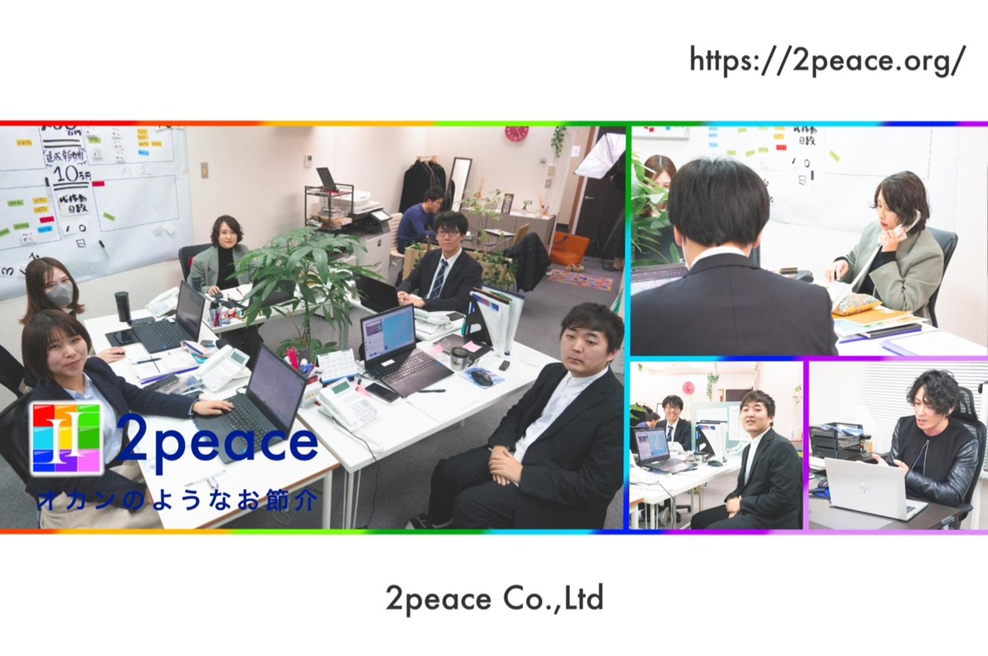 ■オカンのようにお節介で温かく■ 仕事は相手があって初めて成り立つもの。 自分に目を向けるのではなく、他人を思いやれる人間であり続けます。 ▍人財の力で企業の発展に役立ち、豊かで明るい社会づくりに貢献する。 私たちは「人間力」にフォーカスして、人財の皆さんにしっかりと指導、教育を行っています。 人財には2peaceで働くメンバーだけでなく、これから仲間になる方、2peaceから羽ばたいていく方すべてを含みます。スキル・技術の大切さも理解しつつ、何よりも人間性のある人財を輩出してまいります。 ■起業から今につながるストーリー■ 当社代表が社会人人生を歩み始めた当時、自分のために勉強していた学生時代とは大きく変わり、社会では相手の満足度がそのまま自分に跳ね返ってくる感覚を知ることになります。セールスでも自分が売りたいものを売るのではなく、まずは自分を知ってもらい、自分のファンになってもらうことの大切さに気付きました。しばらくして体調を崩し、働くことの大変さ、尊さ、難しさを実感します。 世の中には自分と同じような思いを抱く人がいるはず。 そうした人たちの力になりたい。 自分だからできることがある。 そうは言っても企業に人材を紹介するだけでは、私がやる意味がないだろう。 ならば――。と社会貢献できる事業を結び付けて現在の2peaceを立ち上げます。 ■解決したい問題■ いじめ・不登校など学校にまつわる問題について行政や企業のアプローチが行われていますが、認知件数・生徒数はそれぞれ増加しています。これらの問題には学生時代の過ごし方が深く関わっていると私たちは考えました。実際の活動として当社事業の一環で学校を回って研修を実施し、不登校の状態にいた生徒が通学・登校できるようになったケースもあります。 この取り組みを就職活動につなげれば、学生本人が社会に出て誰かの役に立てるようになります。地方で行えば地域に活力が生まれ、いずれ過疎化が解消されていくはずです。 2peaceは組織体制を整えつつ事業会社を立ち上げ、雇用を賄える環境をつくり、ゆくゆくは地方での人材育成を開始。リモートでも働ける環境をつくっていく所存です。