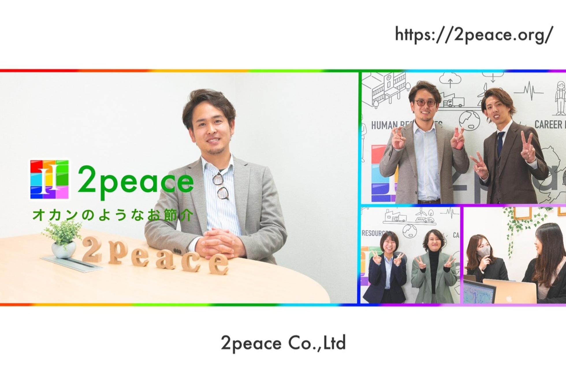 ■オカンのようにお節介で温かく■ 仕事は相手があって初めて成り立つもの。 自分に目を向けるのではなく、他人を思いやれる人間であり続けます。 ▍人財の力で企業の発展に役立ち、豊かで明るい社会づくりに貢献する。 私たちは「人間力」にフォーカスして、人財の皆さんにしっかりと指導、教育を行っています。 人財には2peaceで働くメンバーだけでなく、これから仲間になる方、2peaceから羽ばたいていく方すべてを含みます。スキル・技術の大切さも理解しつつ、何よりも人間性のある人財を輩出してまいります。 ■起業から今につながるストーリー■ 当社代表が社会人人生を歩み始めた当時、自分のために勉強していた学生時代とは大きく変わり、社会では相手の満足度がそのまま自分に跳ね返ってくる感覚を知ることになります。セールスでも自分が売りたいものを売るのではなく、まずは自分を知ってもらい、自分のファンになってもらうことの大切さに気付きました。しばらくして体調を崩し、働くことの大変さ、尊さ、難しさを実感します。 世の中には自分と同じような思いを抱く人がいるはず。 そうした人たちの力になりたい。 自分だからできることがある。 そうは言っても企業に人材を紹介するだけでは、私がやる意味がないだろう。 ならば――。と社会貢献できる事業を結び付けて現在の2peaceを立ち上げます。 ■解決したい問題■ いじめ・不登校など学校にまつわる問題について行政や企業のアプローチが行われていますが、認知件数・生徒数はそれぞれ増加しています。これらの問題には学生時代の過ごし方が深く関わっていると私たちは考えました。実際の活動として当社事業の一環で学校を回って研修を実施し、不登校の状態にいた生徒が通学・登校できるようになったケースもあります。 この取り組みを就職活動につなげれば、学生本人が社会に出て誰かの役に立てるようになります。地方で行えば地域に活力が生まれ、いずれ過疎化が解消されていくはずです。 2peaceは組織体制を整えつつ事業会社を立ち上げ、雇用を賄える環境をつくり、ゆくゆくは地方での人材育成を開始。リモートでも働ける環境をつくっていく所存です。
