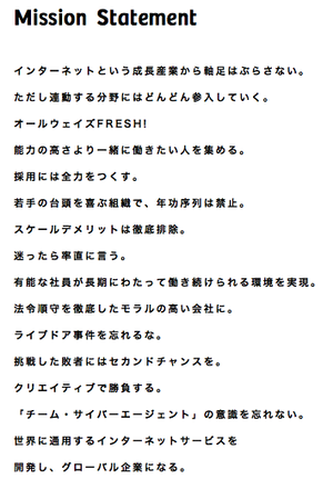 ミッションステートメント サイバーエージェントのビジョンである【21世紀を代表する会社】というゴールを、社員が共に目指すための 基本的なルールです。 このルールを守り、社員ひとりひとりが主体的に動いて、大きなゴールを目指します。