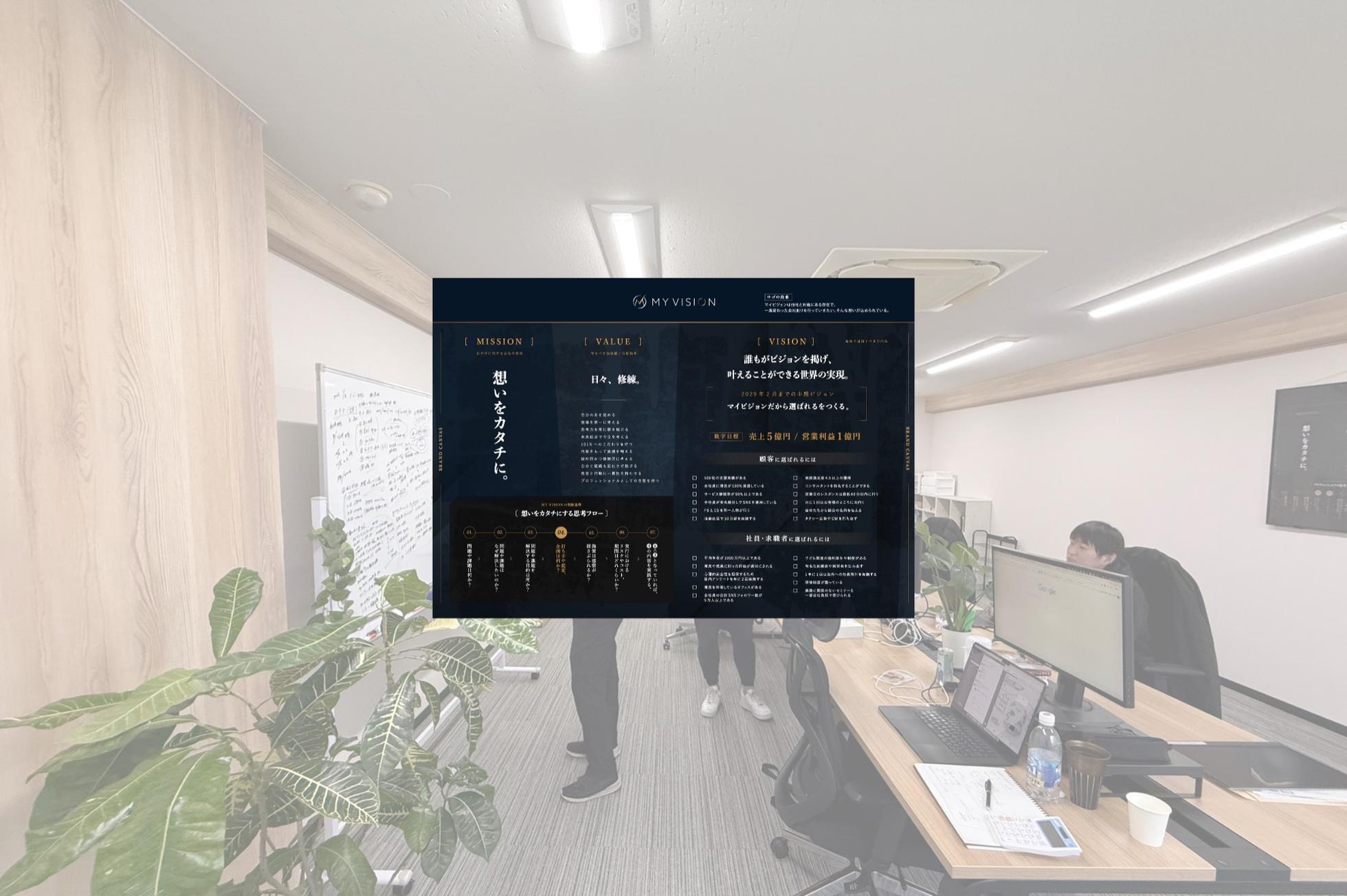 弊社の掲げるVISIONは「誰もがビジョンを掲げ、叶えることができる世界の実現。」です。 みなさんは、自身の叶えたい夢はビジョンはありますでしょうか? 大人になって仕事をしていると「やりたいことを押さえて仕事をする。」という方が多いように感じます。弊社のメンバーは皆んながプライベートでもやりたいことを優先できて、仕事でも成果が出せるような環境を用意しております。 続いて、弊社の掲げるMISSIONは「想いをカタチに。」です。 ここで皆さんに質問なのですが、「世の中にPRだけが上手な会社って多く存在すると思いませんか?」僕はすごく思っています。 何百人の経営者に出会ってきて、感じたのはPRだけが上手な会社よりも地方の中小企業の経営者として戦っている人のほうが何百倍もかっこよくて素敵だということです。 にも関わらず、この中小企業の経営者は表に出ていく方法やPRするやり方すら知りません。 であれば、この中小企業の経営者の想いをカタチにできるようお手伝いをすることが、日本経済を更に良くし、若い世代の選択肢を広げることにつながると思いませんか? 僕たちはそういった想いを持って「想いをカタチに。」というMISSIONのもと、企業ブランディング事業を行っています。