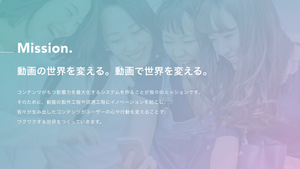 『動画の世界を変える。動画で世界を変える。』 コンテンツがもつ影響力を最大化するシステムを作ることが我々のミッションです。 そのために、動画の製作工程や流通工程にイノベーションを起こし、我々が生み出したコンテンツがユーザーの心や行動を変えることで、ワクワクする世界をつくっていきます。