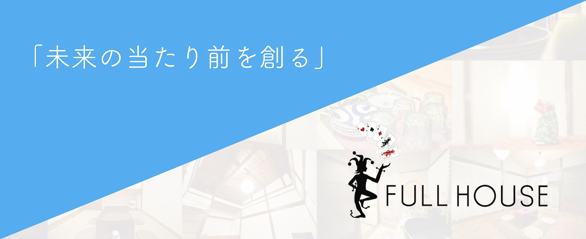 株式会社FULL HOUSEという社名は、トランプのポーカーの役であるフルハウスに由来しています。フルハウスはスリーカードとワンペアが融合したものです。スリーカードは創業者である松本・加瀬・青井をはじめとするFULL HOUSEの創業メンバーを表し、ワンペアはインターネット×◯◯を表しています。