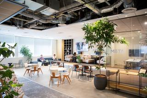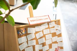 2023年9月に外苑前のオフィスに移転しました。写真はコラボレーションラウンジで、こちらで全社総会やMTGを開催したり、ランチを食べたりしています。