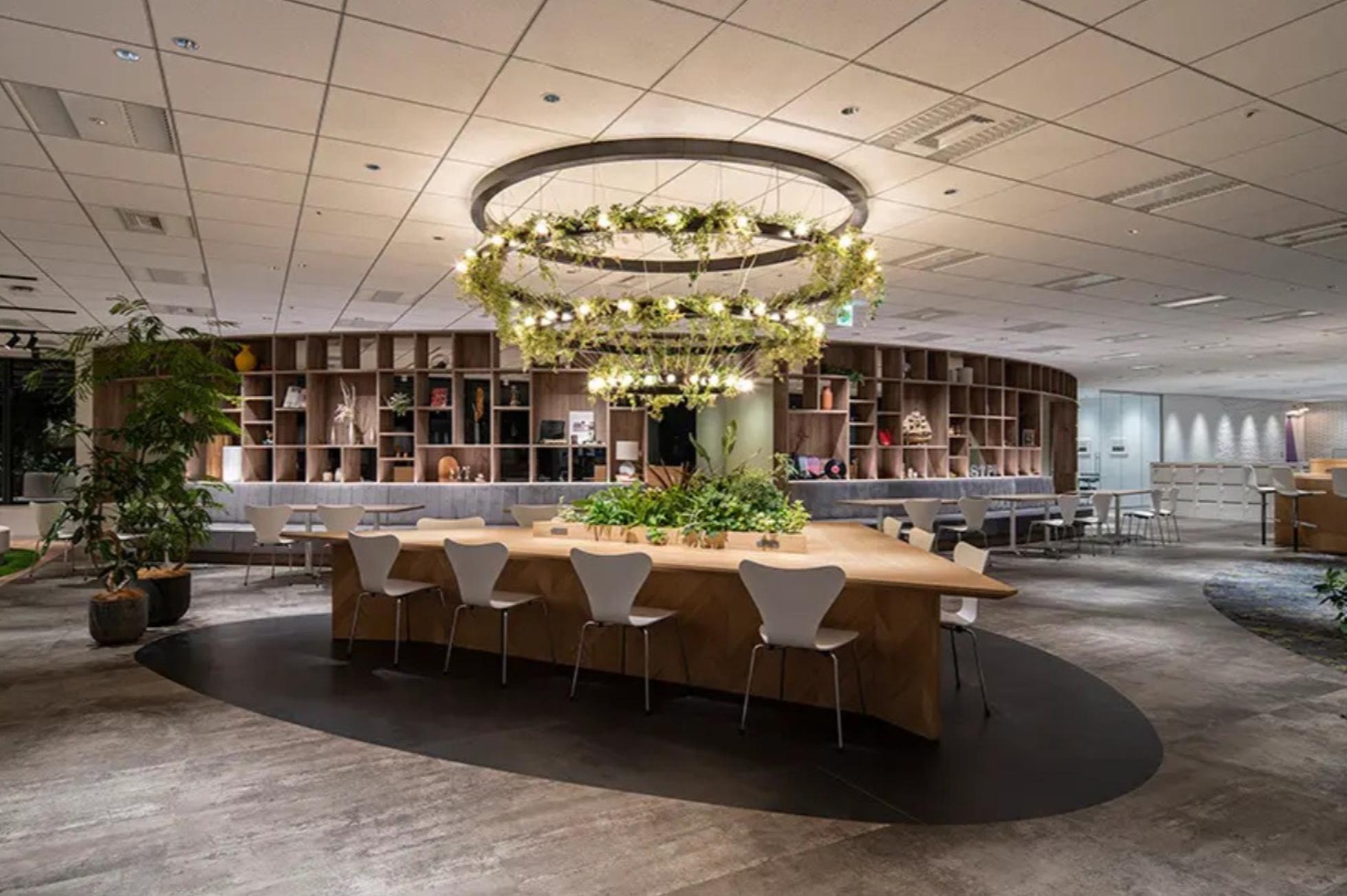 カラフルなカフェスペース、緑あふれる自然エリア、ダーツバーのような遊び心のあるオフィス