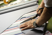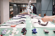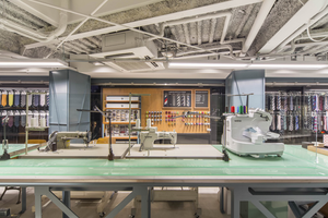 事務所を併設した千駄ヶ谷の店舗。WORK TO SHOP(ワークとショップ)という名の通り、giraffeのネクタイが企画・デザインされ、職人による裁断や縫製などの製造(ワーク)経てショップに並ぶまでのすべてを体感していただける旗艦店です。