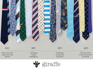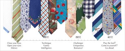 たとえば、38℃。仕事の大事なプレゼン。 緊張する相手とのちょっと豪華なディナー。 なぜかパワーが湧いてこない日……。いつもより一歩前に踏み出したい時には、このネクタイを。