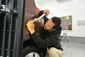 小林はクルマの凹みを塗装せずに直す「ペイントレスデントリペア」でも非常い高い技術を持っています。