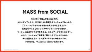 広告業界は「大手のM&A」「専門特化企業の増加」「内製化」「AI活用」の4つが同時進行する転換期です。多くの企業が人手不足に直面しており、TV・販促・PR・SNS・CRMなどを横断して統合できる総合広告会社の価値はむしろ高まっています。 一方で、AIが一般的なインサイトや標準的な企画を作れるようになったことで、人間にしか出せないゼロ次情報やオタク的知識、そして“外れ値”を生む企画力が重要に。FOR YOUもAIを活用しながら、実装・編集・リスク判断といった実践知を強化していきます。 上記を踏まえ、私たちが実現したいのは、専門特化している広告会社ではなく、ソーシャルという強みは持ちつつも、マス広告まで提供することができる“総合広告会社”となることです。 この価値を提供するために、「MASS from SOCIAL」というビジョンを掲げています。 参考記事 ▼ソーシャル起点の消費者行動モデル「5E MODEL」を提唱する総合広告会社FOR YOUの狙いとは https://www.advertimes.com/20250930/article515635/ ▼「FOR YOU広告カンパニー」総合広告事業の目指す場所 https://note.com/foryouinc/n/n9a2c8eaf8367