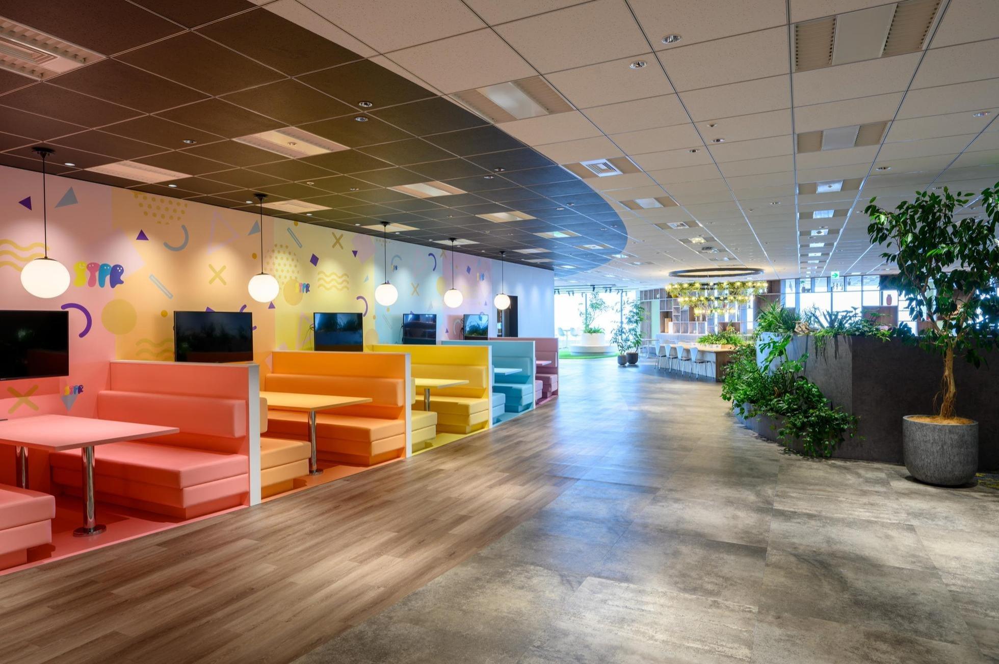 カラフルなカフェスペース、緑あふれる自然エリア、ダーツバーのような遊び心のあるオフィス