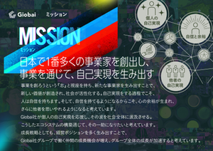 ミッション 日本で1番多くの事業家を創出し、事業通じて、自己実現を生みだす 事業を創ろうという『志』と視座を持ち、 新たな事業家を生み出すことで、新たなベンチャー企業が誕生し、新しい価値が創造され、社会が活性化する。 自己実現をする過程でこそ、人は自信を持ちます。そして、自信を持てるようになるからこそ、心の余裕が生まれ、さらに他者を思いやれるようになると考えています。 Giobai社が個人の自己実現を応援し、その波を社会全体に波及させる。こうしたエコシステムの構築通じて、その一助になりたいと考えています。 成長戦略としても、経営ポジションを多く生み出すことで、Giobai社グループで働く仲間の成長機会が増え、グループ全体の成長が加速すると考えています。