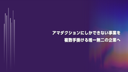 今までのエンタメや芸能を 単純にデジタル化、アップデートするのではなく、 その力を活かして、今までにない、 誰も手を付けなかったあらたな事業を生み出していく。 エンタメ×飲食、×広告、×大学生、×人材・・・ エンタメとビジネスモデルをマッチングさせることで 次々と事業を生み、育て、つなげ、広げていく。 そこで育つ、事業、人、ストーリーが、 また次の、事業、人、ストーリーへとつながっていく。 そうして、 アマダクションにしかできない事業を複数手掛ける 唯一無二の企業へと成長することを目指します。