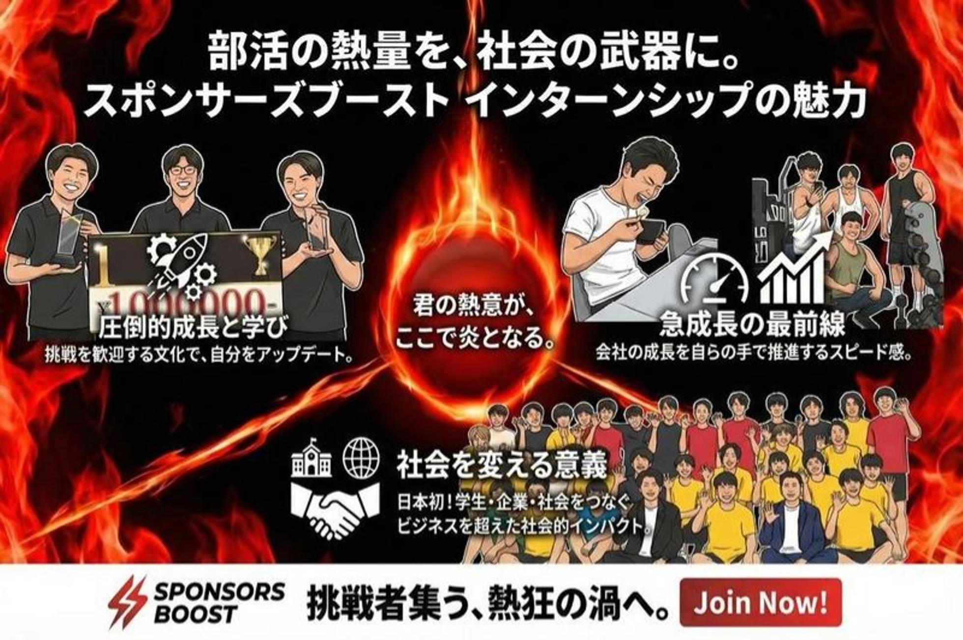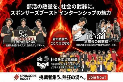 【自己紹介】 資金面の厳しさを目の当たりにして、株式会社スポンサーズブーストに転職しました。 今は営業・人事としてスポンサーズブーストを盛り上げていきます! -------------------------------------------------------------------------------------------------------------- 【趣味】 団子を食う --------------------------------------------------------------------------------------------------------------- 【叶えたい事】 "全ての大学生が夢を叶えられる環境に" 人の笑顔が原動力であるため、 夢を追っている大学生や社会人のことを叶えられるようにしていくことが生きがいです。 --------------------------------------------------------------------------------------------------------------- 【人生においての判断軸】 "ワクワクするかどうか"