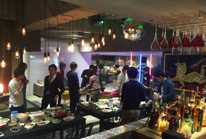 ラウンジを使った社内発表会後の懇親イベント。この日は社長自ら調理したカレーがメインディッシュ。