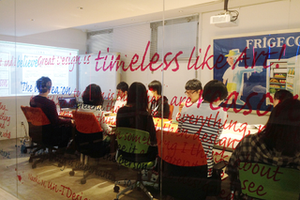 会議室を仕切るガラスの壁には、企業理念の「Great design is invisible!」のタイポグラフィが描かれています。