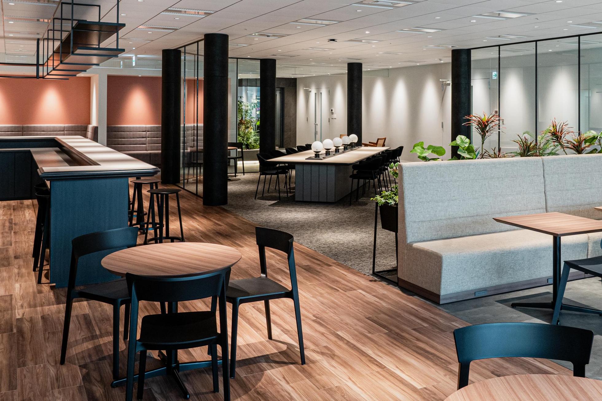 オフィスのコンセプトは、「TORIHADAを造りに集まりたくなる空間」。執務スペースの横にこういった食事や打ち合わせができる万能なフリースペースを広く設け、様々な業種のメンバーが入り混じり、シナジーを生んでいきやすい環境となっています。