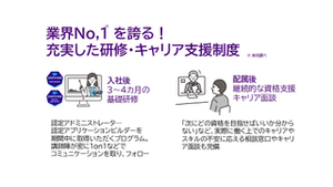 ▮学びながら成長できる環境、エンジニアを育てるサポート体制 体系的な研修プログラム SalesforceやAWSの技術習得を目指し、独自のカリキュラムを展開しています。資格取得を目標に、eラーニングや講師による勉強会も充実しています。また、実務を想定した模擬トレーニングを通じて即戦力のスキルを身に付けられます サポート体制 講師や専任トレーナーによるサポートがあるので、安心してプロジェクトに取り組める環境を提供しています。また、自主的な勉強会や最新技術の習得のための勉強会も定期的に開催されています