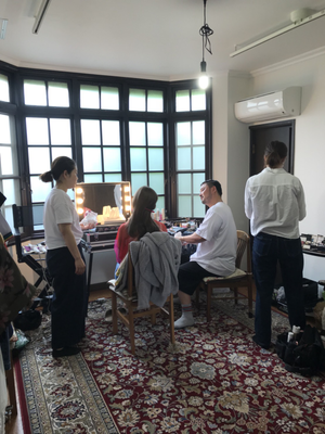 普段の撮影の一コマ。モデルのメイクで朝はスタートです。