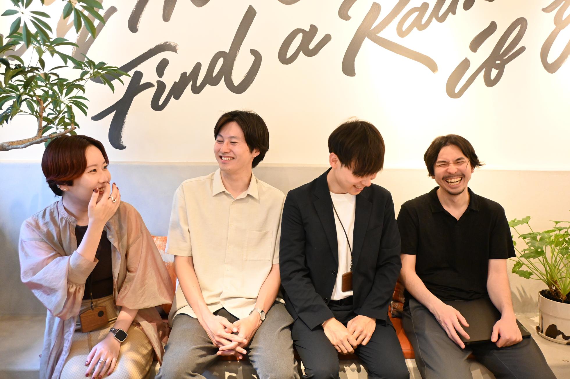 社長(真ん中)は社長と呼ばれることが苦手なのでメンバーはみんな「丹治さん」呼び。フラットな関係性が好み。組織もフラットでありたい!