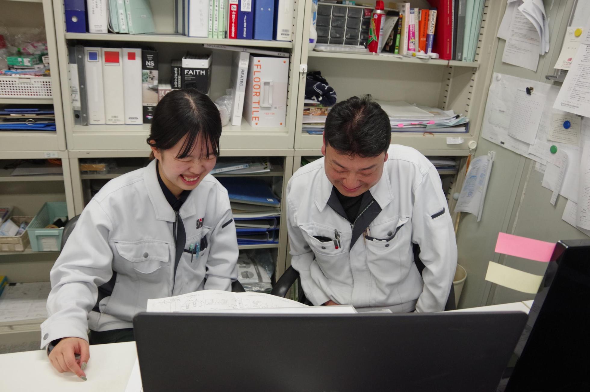 現場だけでなく、オフィスでも建設の仕事は続いています。施工計画の確認や工程管理、品質に関する検討など、一つの建造物を完成させるために丁寧な打ち合わせを重ねます。分からないことはその場で確認し、経験を共有しながら進めていくことで、技術と知識を次の世代へつないでいます。