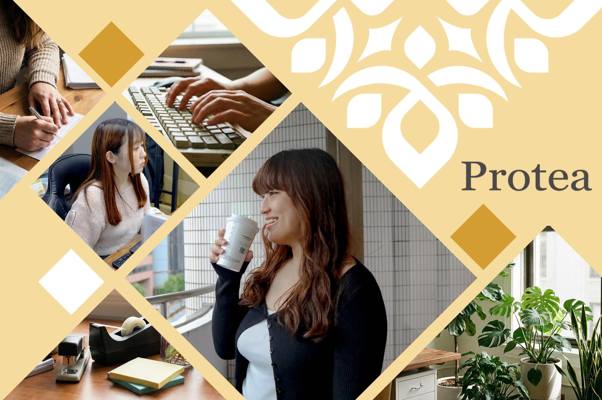 プロテアの花言葉は「王者の風格」「自由自在」「華やかな期待」 Proteaが目指すのは、無数に広がるWEBの世界で「自由自在」に戦略を組み、お客さまを業界の「王者」にする。 またお客さまもProteaにそれを「期待」する。 そして、関わる人々(お客さま)が繁栄し、Proteaも繁栄する。 逆に、お客さまの繁栄なくしてProteaの繁栄はない。 「すべてはお客様の繁栄のために」を社名に込めています。 そのために各部門の垣根を越えて、チーム体制をとっており、「スピード感」「成果」「WEBマーケティングのプロとしての意識」をもって各メンバーが業務にあたっています。 ワンフロアで業務を行っているからこそ困ったことや他のメンバーからの意見が必要になった際には、すぐに聞くことができ、一人ひとりが自分からアイディアを出せる環境です。