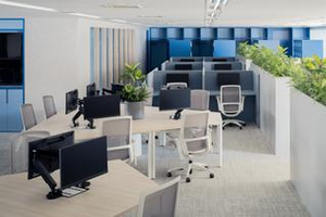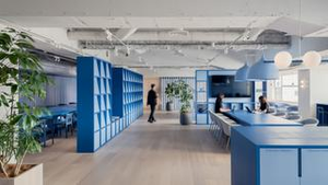 コーポレートカラーのブルーをふんだんに取り入れたラウンジスペースが自慢です。