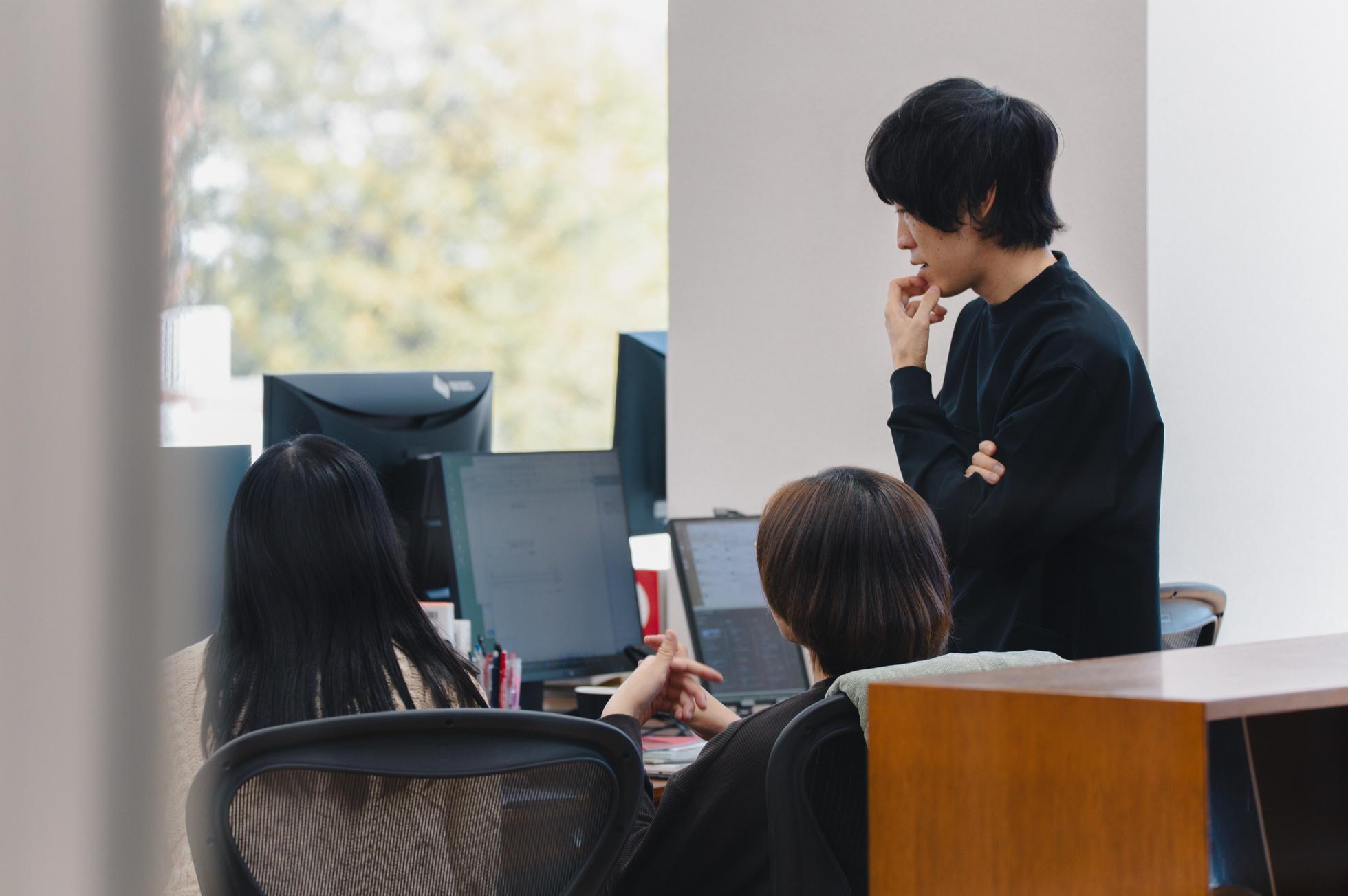 弊社は、少人数体制を十数年以上続けています。 アートディレクター、デザイナー、プログラマー、プロジェクトマネージャーの構成で、会社全体で平均4,5個ほどのプロジェクトを同時に進めています。 少人数の会社として、プロジェクトに判断できる立場として関わり、つくっていく方向性を定め、進めることがほとんどです。やることが見えてきた段階で、我々だけでできないことをさまざまなパートナーや新しく見つけた方々とともにつくりあげていきます。 プロジェクトの人数は少ないときで3名から、多いときは数十人になることもあります。期間は短い場合で3か月くらいから、長いときは1年を超える場合もあります。 進め方についても、毎回違うもの、違う条件でのプロジェクトになりますので、臨機応変にプロジェクト設計をすることが求められ、各人のやるべきことも変わります。 弊社では、肩書きによってある程度の分業を定めてはいますが、それぞれの肩書以上の動き方が推奨されます。本人次第でさまざまな分野にチャレンジできる環境だと思います。型にはまらず、さまざまなことに自ら動き、習得し、課題解決できる方が向いているかと思います。 自分の能力を伸ばし、やれることを増やしつつ、さまざまな方を巻き込み、能力以上のことで、クライアントや世の中に示していくこと、返していくことが、私たちのものづくりのスタイルです。
