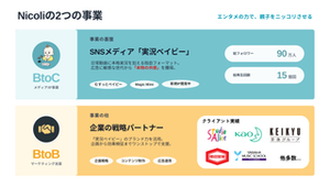 【エンタメの力で、親子をニッコリさせる企業】 私たちNicoliは、2023年8月に設立されたスタートアップです。 「エンタメの力で、世界中の親子をニッコリさせる」というミッションを掲げ、独自のIPを活用した事業を展開しています。 BtoCメディアでユーザーとの強い信頼関係を築き、その資産をBtoB事業で収益化する。 そして、得られた収益を新たなIP開発に再投資する。 この好循環なビジネスモデルが、私たちの急成長を支えています。 ▪️Nicoliについて(ホームページ) https://nicoli.jp/ ▪️エージェンシー事業実績(一部抜粋) 花王株式会社様、ピジョン株式会社様、株式会社スタジオアリス様、ヤマハ音楽振興会様、株式会社亀田製菓様、株式会社ナチュラルサイエンス様、その他多数 ▪️事業内容 ▍BtoC:メディア/IP事業(事業の基盤) 私たちの原点であり、強力な資産がSNSメディア「実況ベイビー」です。 一般の親子から投稿された日常の動画に、元プロアナウンサーである代表の原田が本格的な実況を加える。この独自のフォーマットが支持を集め、総フォロワーは90万人、総再生回数は15億回を突破しました。 広告に敏感な子育て世代から「作り物ではない本物の共感」を得ていることが、私たちの最大の強みです。 現在はYouTubeにてキッズ向け童謡チャンネル「うたってドレみっけ」や工作チャンネル「Magic Mimi」など、新たなIPの創出にも注力しています。 ▍BtoB:マーケティング支援事業(事業の柱) 「実況ベイビー」で構築した圧倒的なエンゲージメントとブランド力を活用し、企業のマーケティング活動をワンストップで支援しています。 クライアントは、ベビー用品、食品、日用品などを扱う大手企業が中心です。 「単なる広告制作や運用代行ではありません。」 企画戦略、コンテンツ制作、広告運用、効果検証までを一気通貫で手掛け、クライアントの課題を根本から解決する「戦略パートナー」として価値を提供しています。
