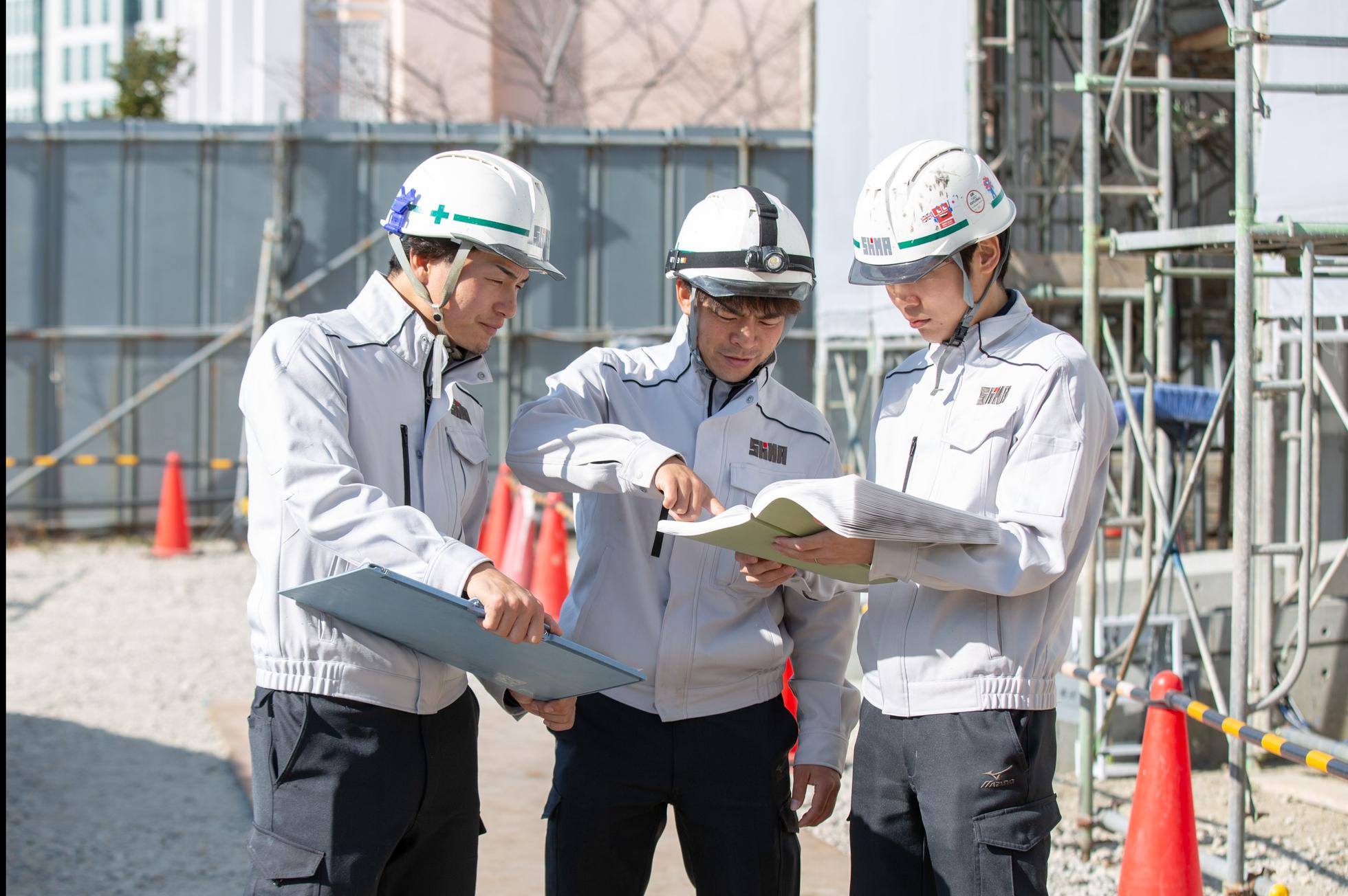 現場だけでなく、オフィスでも建設の仕事は続いています。施工計画の確認や工程管理、品質に関する検討など、一つの建造物を完成させるために丁寧な打ち合わせを重ねます。分からないことはその場で確認し、経験を共有しながら進めていくことで、技術と知識を次の世代へつないでいます。