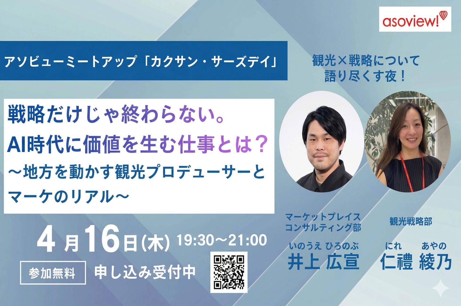 「生きるに、遊びを。」を、仕組みと戦略で実現する。 岡山大学理学部を卒業後、豊田通商にて6年間、自動車部品のグローバルSCM・ロジスティクスに従事。その後、アクセンチュアに参画し、マネージャーとして大手メーカーの戦略策定からBPO設計、システム導入まで幅広い変革を主導。 2023年、アソビューに参画。イノベーション推進部でのレジャー施設経営支援や、業務推進部長 兼 セールスイネーブルメント室長として「事業を伸ばすための基盤づくり」を一手に担ってきました。現在は、自社SaaS「ウラカタ」を導入する総合企画部にてDXコンサルタントを行っております。 商社・戦略コンサルというキャリアを経て、なぜ今「レジャー×DX」という未踏の領域にフルコミットしているのか。大手とスタートアップ、それぞれの視点を持つからこそ語れる「事業を動かす手応え」や「キャリアの本音」を、当日皆さんとお話しできることを楽しみにしています!
